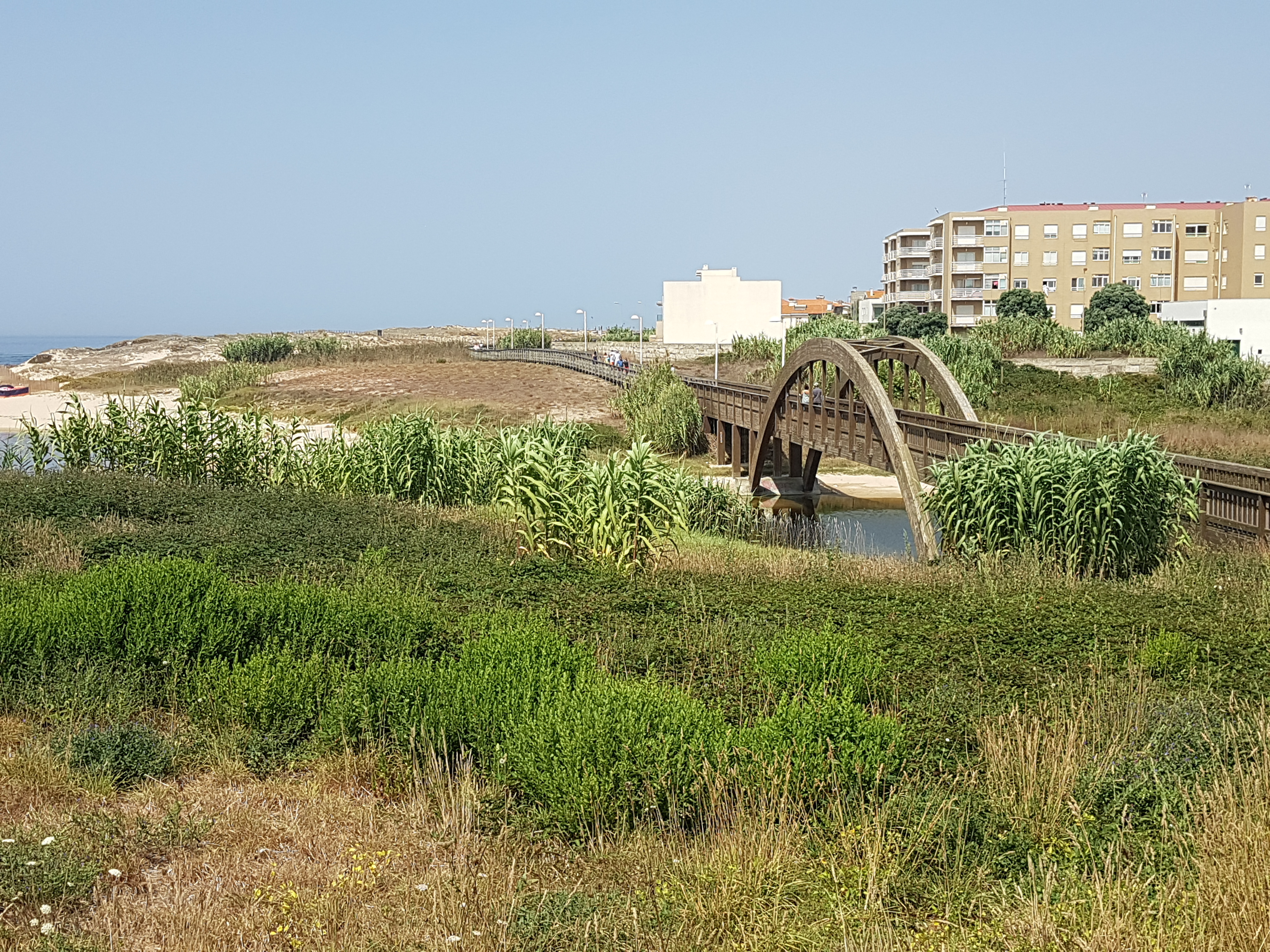 Hade faktiskt tänkt att skippa första biten och ta tåget till Matoshinos. Men en sån vacker morgon med endast fiskegubbarna som sällskap tyckte jag att det kändes rätt att gå hela vägen utan fusk. På bilden ovan så hade jag stannat för att dricka lite vatten och knyta om min skor. Klockan var cirka 6.30. Då Ser jag två personer komma gående. Dom också med ryggsäck på. Den ena som är en kvinna ropar: Ola, Peregrinja. Trots att min spanska är katastrof så förstår jag att hon frågar om jag vandrar pilgrimsleden. Det är vad peregrina betyder. En kvinna som vandrar pilgrimsleden. Si si ropar jag tillbaka och har redan mött mina första vänner på El Camino och det har bara gått en timme sen start.Det blir några märkliga timmar. Det visar sig att dom inte talar någon engelska. Men det är otroligt hur mycket man kan konversera med några få ord och massor av händer och fötter. Efter en timme hittar vi ett cafe. Lycka! När vi kommer till Matosinhos ser jag en bro i fjärran. Vet att vi ska över den då turist informationen informerat mig om detta. Pekar och visar. Mina följeslagare tar ingen notis. Dom har vandrat dessa leder mycket och jag tänker att dom har koll. Vet numera att jag ska lyssna på min intuition. Några damer som gått vilse lurade vi också med oss. Det blev en timme extra. När dagen börjar närma sig lunch undrar kvinnan (som jag inte vet vad hon heter) om jag är hungrig. Det är jag. Hon pekar på MC Donalde. Jag visar med en huvudskakning att jag väljer att gå vidare. Vi säger Bon Camino och jag vandrar vidare till ett strand cafe där jag sätter mig med en kaffe och en baguette med kyckling. Solen skiner och jag mår som en prinsessa.
