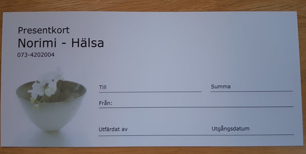 Därför vill jag ge dig möjlighet att köpa presentkort där mottagaren kan välja mellan massage, mediyoga- kurser, klasser, klippkort eller privatsessioner samt produkter som finns hos Norimi. Det bästa är att du kan precisera vad presentkortet är till för, ex en nybörjarkurs i mediyoga, eller bara skriva en summa och låta mottagaren bestämma själv.